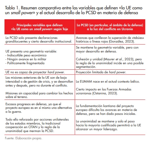 Hace más de una década, el catedrático noruego Asle Toje (2010 y 2011) definió lo que pasó a llamar «la UE como un small power», en la medida en la que la PCSD –máxima expresión de la Unión para actuar como una verdadera potencia en el contexto multipolar (ibídem, 2011: 44)– apenas presentaba progresos, principalmente en defensa.