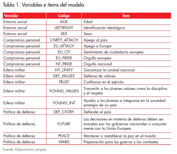 Estos aspectos son críticos para entender la cultura de defensa bajo el mismo marco teórico propuesto para nuestro modelo original, proporcionando una perspectiva integral sobre las actitudes en tiempos de alteración significativa de la seguridad percibida. A pesar de que la disponibilidad restringida de variables limita, en parte, el análisis de este artículo; sin embargo, el análisis parcial permite evaluar la robustez general de nuestro modelo teórico. Y aunque el Eurobarómetro 54.1 (Comisión Europea, 2000) no proporciona una representación exhaustiva de nuestro amplio concepto de cultura de defensa, sigue siendo valiosa ya que abarca las cuatro dimensiones que, según nuestra argumentación, constituyen este concepto. Los indicadores específicos obtenidos de la encuesta cubren aspectos individuales en dos niveles (nacional y europeo). La tabla 1 muestra los detalles de cada una de las variables que componen nuestra medida de cultura de defensa.
