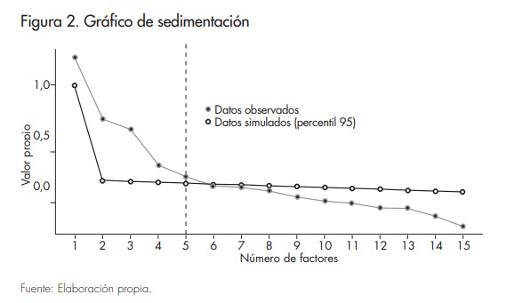 Además, dado que la cultura de defensa es una combinación de múltiples actitudes hacia varios aspectos relacionados con la defensa nacional, concebimos que funciona como un indicador multidimensional. Por lo tanto, un modelo jerárquico es más adecuado para nuestra estructura teórica. Nuestro modelo de cultura de defensa se estructura según se muestra en la figura 1; un modelo de medición de segundo orden en el que, a partir de un conjunto de variables observables (representadas en forma de caja), construimos las cuatro variables latentes exógenas (representadas en forma de círculo) que utilizaremos para cuantificar la cultura de defensa. En efecto, un análisis factorial es muy beneficioso en esta etapa ya que nos permite confirmar la alineación entre los datos y la teoría. Empleamos un conjunto de técnicas visuales y estadísticas para determinar el número de factores a extraer (véase la figura 2). Tanto la «regla de Kaiser» (retener autovalores mayores que 1) como el análisis paralelo sugieren que seis factores son óptimos. Sin embargo, el gráfico de sedimentación nos sitúa entre dos y cinco factores.
