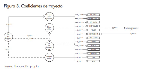 Pasando al segundo nivel del modelo, destaca la variable esfera militar con la carga más alta (0,9). Intuitivamente, las percepciones relativas a la configuración de la esfera militar emergen como elementos cruciales en la conformación de la cultura de defensa europea. La noción de las fuerzas armadas como garantes de la unidad nacional, junto con la alineación de sus valores con los de la sociedad, desempeñan un papel significativo. Por el contrario, la variable «implicación personal» presenta un coeficiente inferior a 0,4, lo que impide considerarla estable. Esta situación puede atribuirse a que es la variable latente con menos ítems. Estos resultados ponen de manifiesto que la cultura de defensa no viene determinada por características no cognitivas como el género o la edad; por el contrario, los aspectos relacionados con el significado y la configuración de las fuerzas armadas emergen como los más influyentes a la hora de explicar la cultura de defensa europea. Este énfasis en la esfera militar subraya la importancia de comprender y analizar las dimensiones simbólicas y funcionales de las percepciones relativas a las fuerzas armadas en la configuración de la cultura de defensa europea.