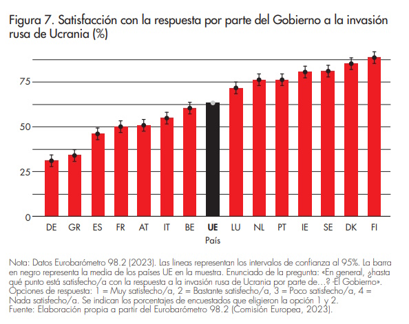 En la figura 7, examinamos el porcentaje de satisfacción con la respuesta del Gobierno a la invasión rusa, un indicador del componente afectivo que mide las actitudes hacia las acciones gubernamentales en tiempos de crisis. Observamos una notable heterogeneidad entre los países: Dinamarca y Finlandia emergen como los más satisfechos, mientras que Grecia y Alemania presentan los niveles más altos de insatisfacción. En Alemania, por ejemplo, apenas un tercio de los ciudadanos se muestra satisfecho con la actuación de su Gobierno frente a la invasión.