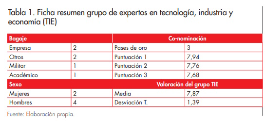 Es relevante que las características del panel de expertos se ajusten a los objetivos del estudio (Keeney et al., 2010), porque ello tiene un impacto directo en la calidad de los resultados, especialmente con respecto a su credibilidad (Donohoe y Needham, 2008). Por eso se utilizó un sistema de co-nominación de los expertos por parte de 13 investigadores en cuestiones afines, en el que se evaluó a cada uno de los propuestos atendiendo a su grado de conocimiento y experiencia (entre 0 y 10 puntos). El grupo de expertos fue de seis personas, con bagaje empresarial (dos), militar (uno), académico (uno) y una categoría abierta que incluía, entre otros, a periodistas o consultores con una reconocida competencia en la materia (dos). En el caso de temáticas muy especializadas conviene centrar la discusión entre menos agentes si es posible, para poder llegar a algún tipo de acuerdo o consenso. Entre las críticas a esta metodología se encuentra la imposibilidad de replicar los resultados (Bohnsack, 2004), por ello es conveniente desarrollar una selección cuidadosa de los expertos. En este caso, se convocó a los expertos con mejor puntuación, junto con otros que recibieron invitación directa (pases de oro), debido a su reconocida competencia sobre la materia. Así, se conformó un listado ordenado de petición de participación en el estudio por nivel de experto con 22 nominados evaluados con un coeficiente en media de 7,87 puntos sobre 10 y una desviación típica de 1,39 (véase ficha resumen en la tabla 1).