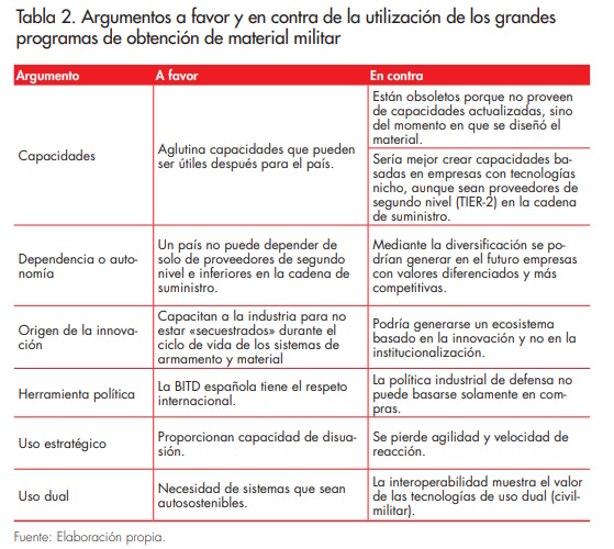 Según los expertos, el sistema de adquisiciones español, basado tradicionalmente en grandes programas, no es suficiente para garantizar las capacidades militares necesarias; por ello, la colaboración –sobre todo internacional–, está facilitando la creación de consorcios empresariales. En el lado opuesto, existe una corriente de pensamiento estratégico que aboga por limitar la colaboración entre las empresas de la BITD para no aumentar la concentración en los mercados de material de defensa y los oligopolios nacionales (véase, por ejemplo, Anderson, 2023). Los argumentos a favor y en contra del uso de los grandes programas que esgrimieron los expertos se encuentran recogidos en la tabla 2, organizados de la siguiente forma: capacidades; dependencia o autonomía de terceros; el origen de la innovación que garantice el acceso a las tecnologías más novedosas; el uso de los programas como herramienta política y su uso estratégico; y la inclusión necesaria de tecnologías de uso dual (que se desarrollen en el ámbito civil o en el militar y puedan utilizarse, con la debida adaptación, en cualquiera de ellos).