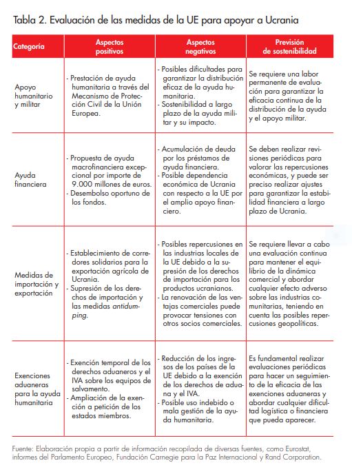 La tabla 2 presenta una evaluación de las principales medidas de la UE de respaldo a Ucrania, que abarcan apoyo humanitario y militar, ayuda financiera, medidas de importación y exportación, y exenciones aduaneras para la ayuda humanitaria. En ella se examinan los aspectos positivos, los inconvenientes, las previsiones de sostenibilidad y la relevancia académica. El apoyo de la UE a Ucrania es esencial para fortalecer sus capacidades de defensa, evitar nuevas agresiones y aumentar la estabilidad regional. La ayuda financiera contribuye a la recuperación económica del país, crucial para su resiliencia e independencia. La sostenibilidad depende de la continuidad de las acciones económicas. Las medidas de importación y exportación estimulan el comercio, pero es imprescindible gestionar los posibles desequilibrios. Las exenciones aduaneras para la ayuda humanitaria garantizan una respuesta eficaz a la crisis. En conjunto, estas medidas refuerzan la seguridad, la economía y la respuesta a la crisis de Ucrania y reflejan el compromiso de la UE con la estabilidad y la recuperación de este país.