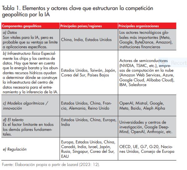La mayoría de los análisis sobre la geopolítica de la IA y de las nuevas tecnologías suele identificar diferentes elementos o dimensiones estratégicas que articulan la competición entre grandes poderes (véanse, entre otros: Lee, 2018; Lazard, 2023; Stango, 2024). Algunos de los elementos que aparecen de modo más recurrente en estos trabajos son los siguientes: a) los datos; b) el hardware o infraestructura que hace posible la IA; c) la innovación o capacidad de desarrollar grandes modelos algorítmicos; d) el talento o capital humano; y e) todas las cuestiones entorno a la gobernanza o la regulación de la IA.