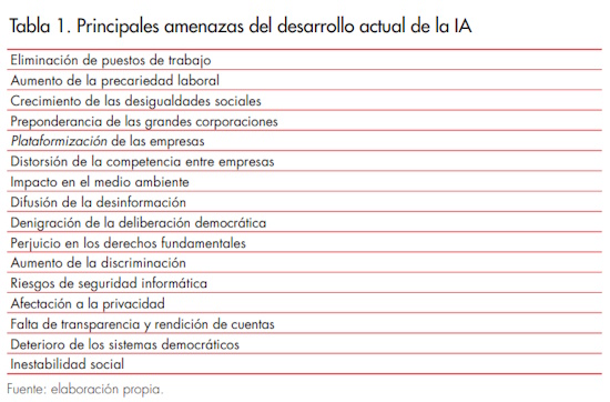 Además de la eventual eliminación de tareas que hoy desarrollan personas a causa del desarrollo de la IA, otro de los grandes riesgos es la plataformización de las empresas, ya que los trabajadores actuarían como falsos autónomos que facturan sus servicios a la plataforma en cuestión, si bien con una relación laboral exclusiva y permanente. La Confederación Europea de Sindicatos (CES) calcula que actualmente hay 28 millones de personas en Europa en esta situación: personal laboral sin capacidad de negociar de forma colectiva sus condiciones de trabajo (Cruz, 2023).
