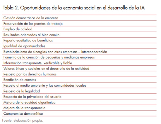 En este contexto, las empresas de economía social no pueden a renunciar a la IA, pues esta es muy útil en diferentes áreas y tareas: innovación, producción, logística, gestión de personas, etc. La clave está en hacer un uso de estas herramientas basado en los siete principios fundamentales de la economía social enumerados al inicio del presente artículo. Así, las organizaciones que desarrollen aplicaciones y herramientas de IA deberán priorizar los intereses de las personas, basándose en unos valores éticos y sociales y prestando especial atención a la discriminación de las personas y los colectivos, sobre todo en lo concerniente a los puestos de trabajo. En resumen, IA y economía social pueden y deben relacionarse para promover un desarrollo de la IA de potente oportunidad tecnológica, basado en principios como la justicia, la equidad o la sostenibilidad. De hecho, se considera que existe la necesidad de desarrollar la IA de una forma alternativa. Stiglitz (citado en Co-operative News, 2016) ha defendido que las cooperativas, junto con otras iniciativas de la economía social, proporcionan «un tercer pilar clave para remodelar la economía globalizada». Por su parte, Rifkin (citado en Alianza Cooperativa Internacional, 2016) explica que las cooperativas podrían liderar un cambio de paradigma en diferentes sectores, también en el tecnológico, y las alienta a utilizar su dominio web «.coop» y a crear nuevos algoritmos y aplicaciones para utilizar los datos de forma ética, a la vez que incita a los cooperativistas a desarrollar sus propias redes sociales, tipo Facebook, Google, Twitter, o plataformas de transporte.