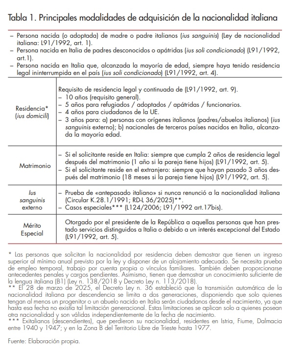 La tabla 1 resume las principales modalidades para la adquisición de la nacionalidad italiana. El carácter restrictivo del sistema italiano se debe, por una parte, a la marcada predominancia del ius sanguinis sobre el ius soli. En efecto, la nacionalidad italiana se adquiere principalmente por linaje o ascendencia; mientras que el ius soli se emplea en principio para evitar situaciones de apatridia infantil. Por la otra parte, responde a la severidad de los requisitos que regulan el ius domicili (la naturalización por residencia en el país), entre los cuales destaca la necesidad de demostrar una residencia legal y continuada de diez años. A esto se suman otros requisitos de tipo fiscal, económico y de integración, que hacen la adquisición de la nacionalidad por residencia especialmente difícil para las personas extranjeras que viven en Italia.