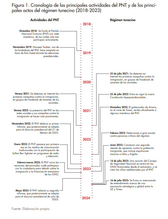 La actividad en línea del PNT precedió a los cambios en el discurso y la política oficiales, lo que apunta a que el régimen empleó la creciente popularidad de este partido para poner a prueba y calibrar la opinión pública antes de adoptar determinadas posturas antiinmigración (ibídem). Como recuerda Vincent Geisser (2023b: 10): «El discurso presidencial del 21 de febrero (...) representa, al más alto nivel del Estado, la continuación de una campaña racista que lleva varios meses extendida en el país con el objetivo de preparar a la opinión pública para un endurecimiento sin precedentes de la política migratoria». Esto es, tuvieron un efecto de «luz verde»: «El 21 de febrero, [Saïed] dio luz verde a la gente que se mostraba escéptica al respecto y que podía dudar un poco de si esto es racismo. Pero con lo que dijo el 21, quienes mantenían el escepticismo empezaron a tener una mayor seguridad y convencimiento de que esto no es racismo; y si es racismo, no me importa en absoluto. Se trata de la seguridad nacional; este es mi país, y no quiero que se convierta en otra Palestina»[13].