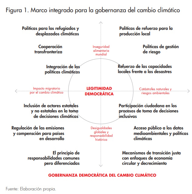En nuestro análisis nos hemos centrado en los retos políticos críticos que el cambio climático plantea a la gobernanza democrática. La proliferación de regímenes autoritarios con justificación ambiental, el incremento de desastres naturales y la profundización de inseguridades, como la alimentaria, las desigualdades históricas y la migración climática, evidencian la necesidad de un enfoque integral, respuestas coordinadas y multidisciplinarias. Se trata de que el estudio de la gobernanza del cambio climático capte con mayor precisión la naturaleza polifacética de las amenazas del cambio climático a la gobernanza democrática. Estas teorías interrelacionadas pueden sentar las bases de un marco conceptual que parta de las transformaciones sociales contemporáneas y examine sus implicaciones para la gobernanza democrática en el contexto del cambio climático.