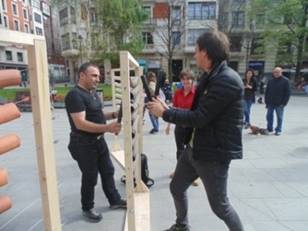 Para atraer al mayor número de viandantes, pensé también que sería adecuado contactar con diversos músicos, percusionistas y txalapartaris, cosa que logré tras realizar unas pocas llamadas. Los músicos eran procedentes de diferentes lugares de Euskadi, que habían participado en una gran parte de acciones artísticas o de protesta en cuanto a los intereses de la propia tierra vasca. Tuve la oportunidad de tener al grupo Txalamako Txalaparta Taldea, que es bien conocido entre los txalapartarisde Vitoria-Gasteiz. La performance callejera se desarrolló durante dos días y observé que existía una diferencia fundamental en la interacción con la performance entre las personas que conocían el instrumento de antemano y las que no.