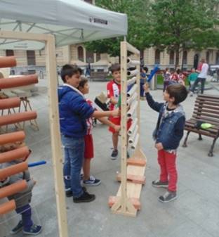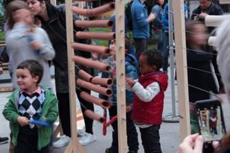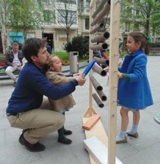 Las piezas fueron colocadas por toda la plaza a modo de instalación. Fue bastante sencillo tomar contacto con jóvenes entre edades comprendidas entre los 3 y los 12 años, se mostraron dispuestos a la participación desde el primer momento. Par la tarde, estos niños incitaban a sus familiares a participar. Eran realmente esos jóvenes los que creaban esa idea de acción performativa, que los vinculaba con esa tradición improvisada de los ritmos suburbanos del pasado al tiempo que conseguían ser elementos integradores entre diferentes grupos de edad.