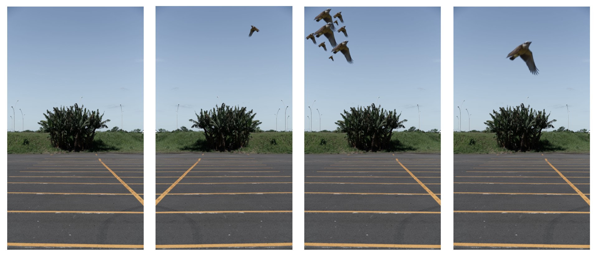 É deste contexto – e do interesse em negociar relações entre a paisagem urbana, o legado do colonialismo e a ação humana (material e simbólica) sobre os ecossistemas – que surge a série de imagens que dá origem à instalação analisada. A bananeira – frequentemente associada à fragilidade das democracias no continente 9 – foi introduzida na América Latina visando a produção de frutos para a exportação, porém se tornou tão presente na paisagem que muitas vezes é tida como uma espécie nativa. A imagem fotográfica captada ganha uma nova camada quando um bem-te-vi – ave 10 nativa da região – cruza o frame no momento exato do disparo. A fotografia original é então posteriormente manipulada de forma a produzir um políptico composto de quatro imagens (Figura 1), cujo conjunto busca amplificar e explicitar a agência da ave ao se colocar no quadro. A imagem é ampliada, distorcida e multiplicada buscando produzir estranhamentos a partir da presença do pássaro de forma a tensionar relações entre nativo e exótico, local e global, importado e imposto.