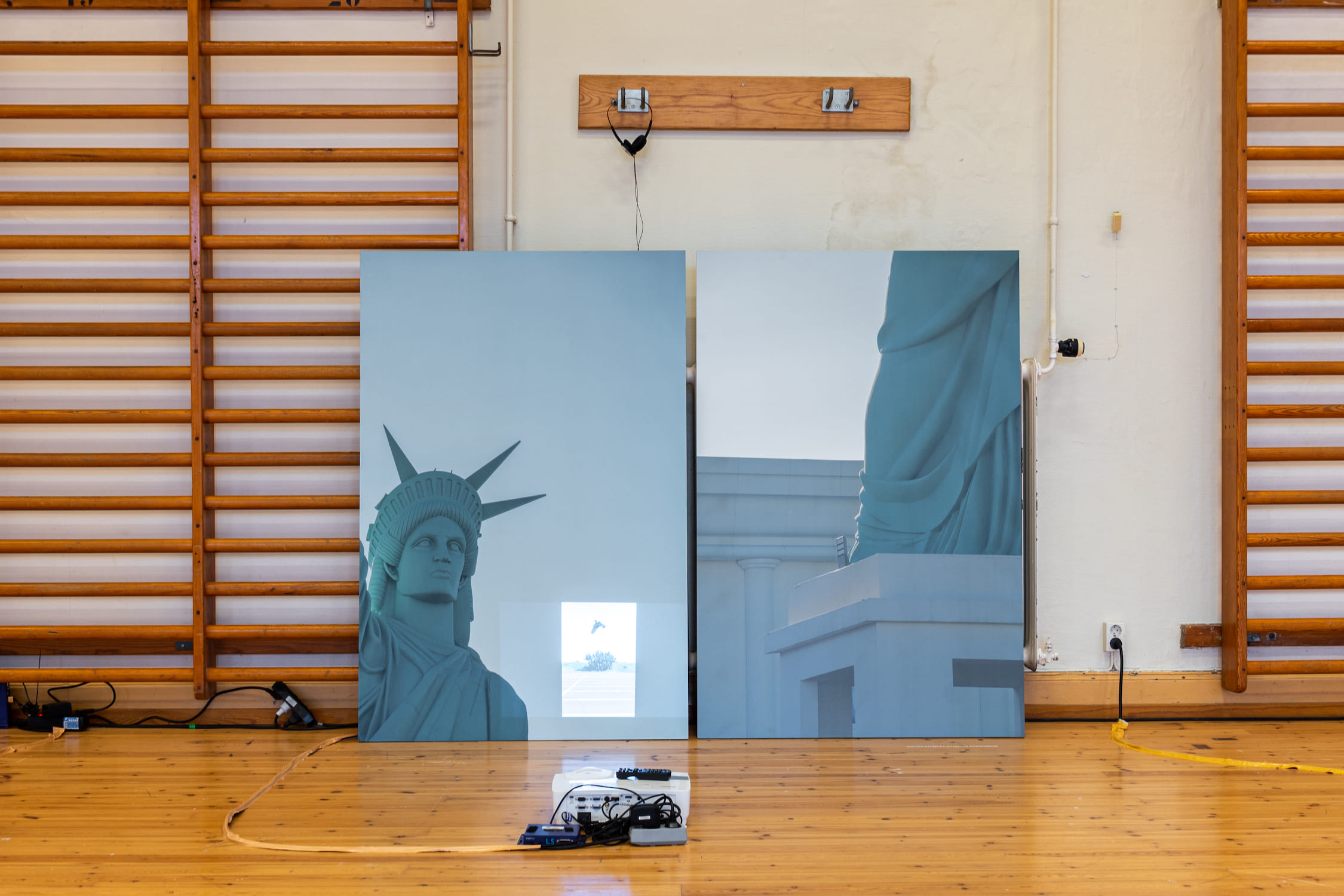 Paralelamente ao desenvolvimento da peça sonora, outros elementos da instalação iam tomando forma. Em colaboração com Jenny Lindhe, curadora da exposição, as 4 imagens da série Bem-te-vi e Bananeira (2019) foram combinadas com duas imagens da série Estátua da Liberdade (2019), também produzidas como parte do projeto Cartas para ultramares (Figura 3). Foi definido que as 4 imagens de Bem-te-vi seriam projetadas sequencialmente sobre as duas imagens de Estátua (impressas em jato de tinta sobre papel medindo 150x100cm). Acima das imagens, se via um par de fones de ouvido com os quais os espectadores podiam ouvir a peça composta por Isadora Martins, em uma versão na qual os poemas são recitados em inglês.