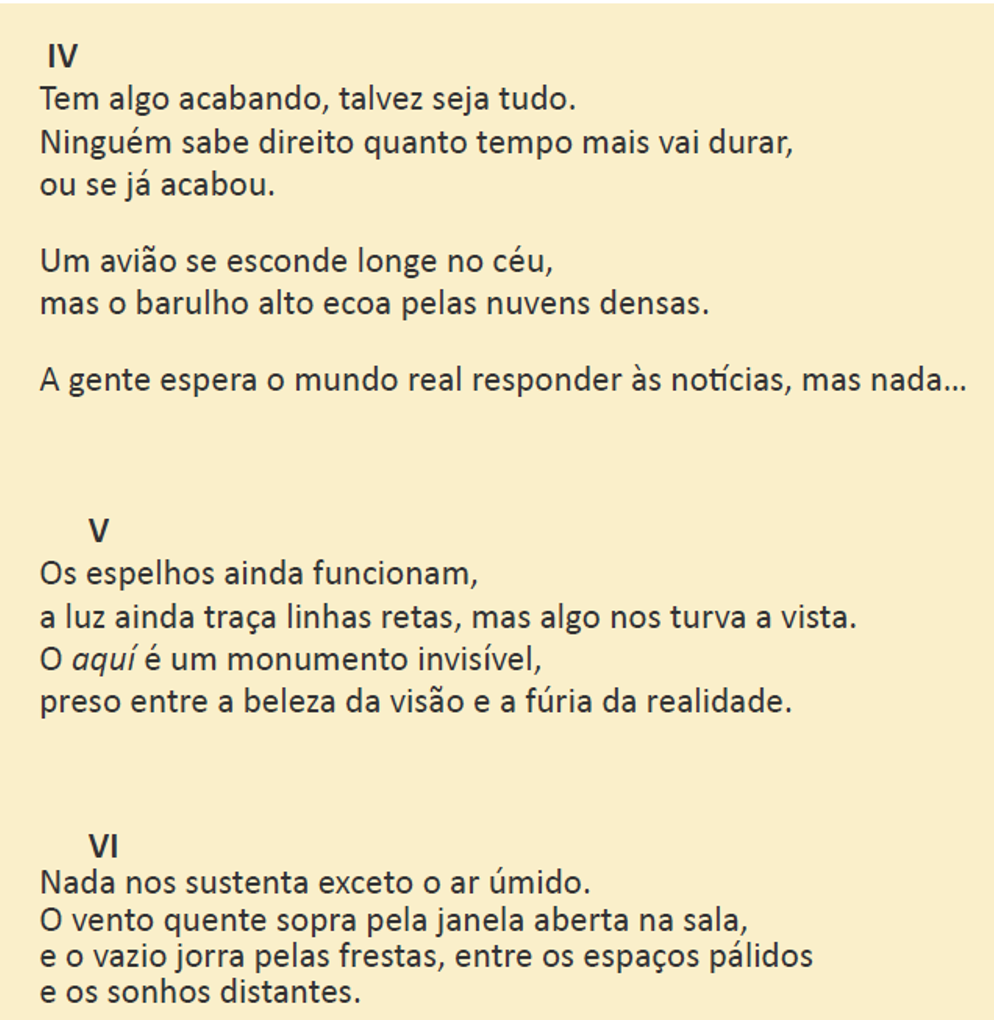 José Gil (2018, 21–2) observa, na condição de um filho de colono em Moçambique, uma múltipla cisão "entre o mundo material e elementar de África [...] e o mundo cultural de Portugal [...] aparentemente transparente, mas sempre inconscientemente residual, artificial". Embora nossas experiências tenham inúmeras diferenças marcantes, essa cisão se aproxima da que observamos em nosso cotidiano. Uma ruptura que – como um hiperobjeto – pode não estar sempre acessível, mas está sempre presente. Se a cisão de que fala Gil se estabelece entre a África e Portugal, a nossa se estabelece entre a América que nos cerca e uma outra América: geograficamente e socialmente distante, mas que sempre orbita o imaginário.