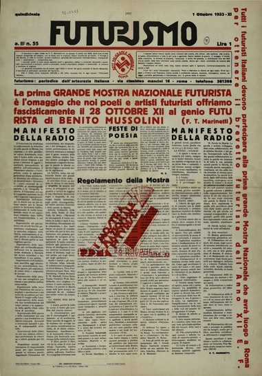 Otras intervenciones se englobaban en el discutible epílogo que identifica al futurismo con el fascismo y en la que la aeropoesía se convirtió en una parte de las radiocrónicas belicistas. Marinetti declamó en la radio el retorno transcontinental de los hidroaviones de Italo Balvo en 1933. Las declamaciones y emisiones futuristas en tiempos de guerra fueron rechazadas por los oyentes por su experimentalidad y extravagancia. Las últimas intervenciones futuristas para el EIAR (Ente Italiano per le Audizione Radiofoniche) se redujeron a diez minutos: el máximo de poesía futurista que el público italiano podía soportar (Mancebo Roca 2004, 69).
