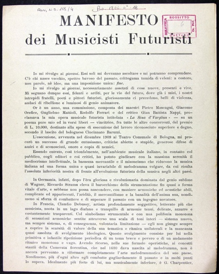 En el caso de la música, Marinetti elegiría al compositor Francesco Balilla Pratella para que concibiera una propuesta acorde con la sensibilidad de la máquina y la ciudad industrial (Lista 2011, 135), incitándole a superar el simbolismo mediante una música “más que moderna, profética, liberada de cualquier nebulosidad, de mitos y leyendas, de la obsesión idílica agreste y las monerías erotómanas” (Hulten 1992, 527). Pratella, musicólogo de sólida formación, había sido discípulo de Pietro Mascagni y experimentaba con nuevos lenguajes partiendo del concepto de la maestría y la tradición. Pratella, en el fulgor de las proclamas, escribiría tres manifiestos: el Manifesto dei musicisti futuristi, el 11 de octubre de 1910; La musica futurista: Manifesto técnico, el 11 de marzo de 1911 y La distruzione della quadratura, el 18 de julio de 1912.