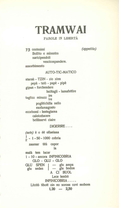 La Onomalingua.verbalizacione astratta (1916) fue una variante de las parole in libertà, una poesía sonora visual, gestual y musical que derivaba “de la onomatopeya, del ruidismo, de la brutalidad, de las palabras en libertad futuristas” en la que Depero exploraba “los contenidos psíquicos de las sensaciones físicas” (Lista 2011, 237) y recreaba sonidos naturales y artificiales “ruidos creados por los hombres: bicicletas, tranvías, trenes, automóviles y todas las máquinas” (Depero [1934] 2012, 42). En la onomalingua, por tanto, la cualidad sonora de las palabras se descargaba sobre el papel. En Tramvai y Tramme reconstruía los ruidos estridentes del tranvía sobre las vías y los pensamientos se confundían con la estela del movimiento. Fiorillería- Aciaicìa – Cristalizia (sensazioni di fiori-sensazioni de metalli- sensazioni di vetri) recreaba los ruidos metálicos mecánicos producidos por los engranajes combinados con el cristal y elementos de naturaleza vegetal.