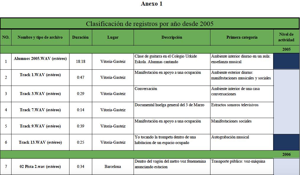 Como parte del desarrollo práctico y teórico de mi tesis, propongo un análisis de registros sonoros y una tabla de actitudes artísticas respecto a los casos artísticos analizados. Esa base de datos contiene más de 1000 registros de audio desde 2015 a 2017, realizados en España, México y Francia. Estos archivos se han utilizado para experimentar a través de la creación sonora y audiovisual, como registro de acciones e intervenciones que he realizado en espacios locales como en Bilbao, y para un análisis objetivo a partir de una selección, experimentando y explorando las distintas formas de creación artística a través del sonido.