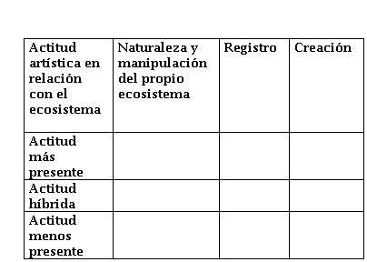 Desde el punto de vista de la actitud del artista en relación con el ecosistema sonoro, se diferencian tres actitudes: más presente, menos presente e híbrida. Lo que me condujo a observar que la identidad del ecosistema sonoro es utilizada por distintos artistas y de múltiples maneras, de modo más o menos presente en cuanto al nivel de relación que se establece entre el sujeto y el entorno. A estas relaciones las denomino actitudes, siendo ellas más directas e indirectas según los casos, ya sea para transformar el propio ecosistema, para traducirlo o simplemente para reproducirlo.