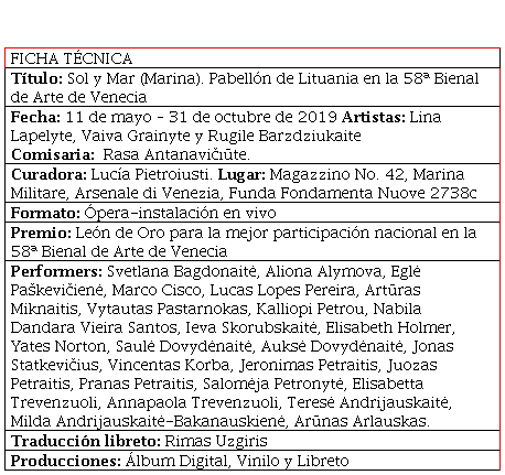 Abstract: This text analyzes the piece Sun & Sea (Marina), which was awarded the Golden Lion for the best national participation at the 58th Venice Art Biennale (2019). Although the ecological message of the work has usually been highlighted, it also triggers some other interesting reflections and connects with various aspects of the analysis of our own time to be in-depth explored and reviewed. Thus, we explore its associations with the creative activity previously carried out by its authors, the way it tangles with pieces by other Lithuanian artists, and how it intertwines the conceptual developments of various thinkers who cast a critical eye on our contemporary society and the values on which it is based. Likewise, we carefully observe the consequences of the use of the opera-performance format and the possibilities it unfolds to promote projection from the spectators' own experience, making use of scripted live-action and sung dialogues, drawn from irony and humour as support for critical positions.