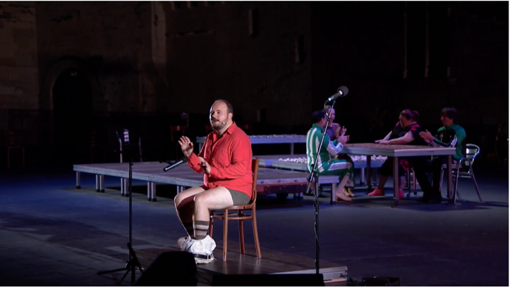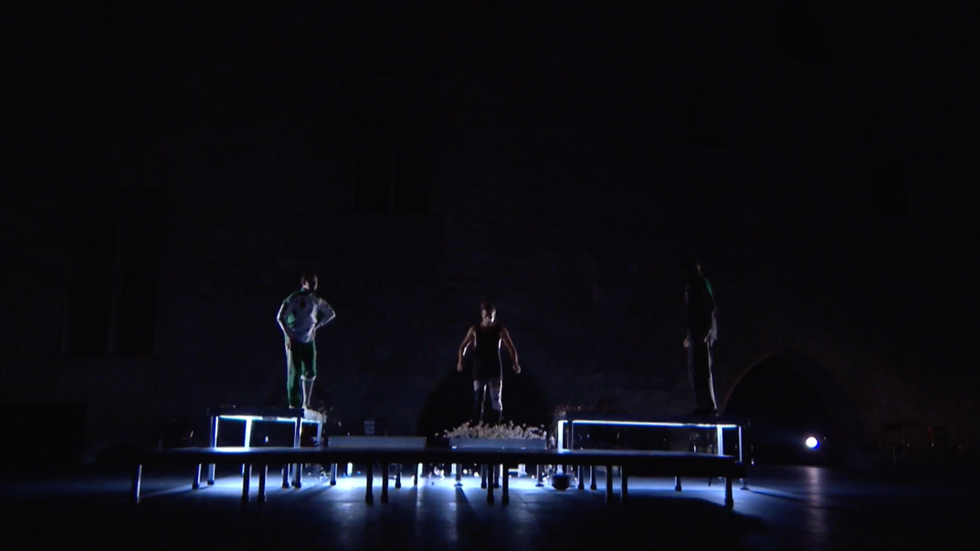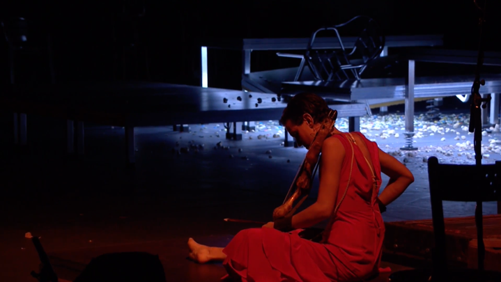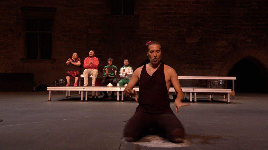 Con el escenario desnudo y rompiendo la cuarta pared con el espectador, profundiza en el concepto que representa la fiesta desde la más absoluta libertad, con sus detalles, gestos, movimientos, sonidos y energías. Por lo que, el resultado obtenido es una ‘comunión’ entre los intérpretes donde, como actores, contribuyen al texto y desarrollo de la obra en favor del diálogo, herencia de Mario Maya. Todo esto envuelto en sonidos guturales, jaleos, onomatopeyas, fragmentos de canciones en francés, inglés y alemán, risas, llantos, gritos, palmas sonoras y mudas, nudillos sobre la tarima o los dientes, sonidos con las monedas, las piedras o las chapas, y acompañados de instrumentos como el clavicordio, armonium, guitarra, violín, una pata de jamón, -que igual hace de guitarra que de violonchello-, o ghungroo.