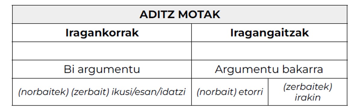 Aditzak sailkatzerakoan, argumentuak dira aintzat hartzen direnak. Argumentuak diogunean besterik gabe esan nahi dugu zein diren aditzak adierazten duen ekintza, egoera eta abarretan partaide direnak. Adibidez, esnatu badiogu, norbait da esnatzen dena, umea adibidez (a). Horrek esan nahi du umea dela aditzaren argumentua eta argumentu hori absolutiboa dela (nor deitu izan dena). Edo jo dezagun ikusi aditzeko perpausera (b): orduan, ez da argumentu bakarra, baizik bi argumentu ikusi ekintzak dakartzanak: umeak eta itzala adibidez (nork eta zer). Irakurlea konturatuko denez, beraz, argumentu kopuruari ez ezik, argumentuen izaerari ere begiratzen zaio, eta argumentuen izaera diogunean, zein kasudun argumentuz ari garen adierazi nahi dugu, alegia, absolutibo (nor), ergatibo (nork) ala datibo (nori) argumentua ote den hautatutakoa.