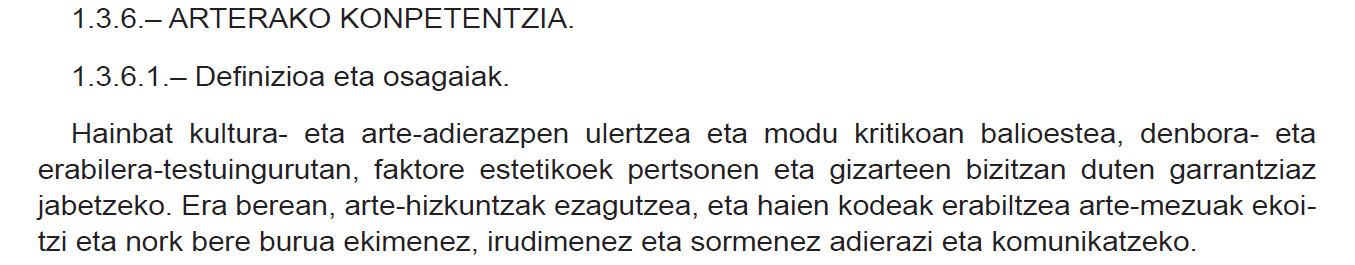 Horretan, eta marko guzti hau oinarri hartuta, Arterako konpetentzia definitzen dituen lehenengo hiru puntuetan jarri nahi genuke arreta, agerikoa baita Arterako konpetentziari eransten zaion komunikazio- eta adierazpen-kutsua, seguruenik, aurretiaz definitutako hitzez, hitzik gabe eta modu digitalean komunikatzeko zehar-konpetentzia garatze aldera proposatutakoa.