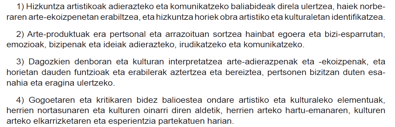 Batetik, orain aztertzen gauden curriculumaren kasuan, bai edukien azalpenetan bai eta ebaluazio irizpideen hurrenkeretan ere, hainbatetan aurkituko dugu mimesian oinarritutako errealitatearen edo subjektibitatearen irudikapena dela artelan baten helburu osoa, edo behintzat, hezkuntza artistiko baten helburu nagusia, halaxe definitzen baitira Arterako konpetentziaren osagaiak hasiera-hasieratik, kasu, lehen aipatutako “hizkuntza artistikoak adierazteko eta komunikatzeko baliabideak direla” baieztatzen duen osagaia (EHAA 2016/141, 131), edota Bigarren Hezkuntzara zuzendutako testua, non Hizkuntza plastiko eta bisuala delako eduki multzoak elementu formalen ezaguera irudikapenak sor ditzakeen zeinuen interpretazio edo esanahietan oinarritzen duen, arteak berezkoa duen jakintza norbanakoaren ideien eta emozioen komunikaziorako eta adierazpenerako medio eta baliabide gisa aurkeztuz, eta horien gainean arterako konpetentzia eskuratzeko praktika eta eduki oro eraiki (EHAA 2016/141, 254).