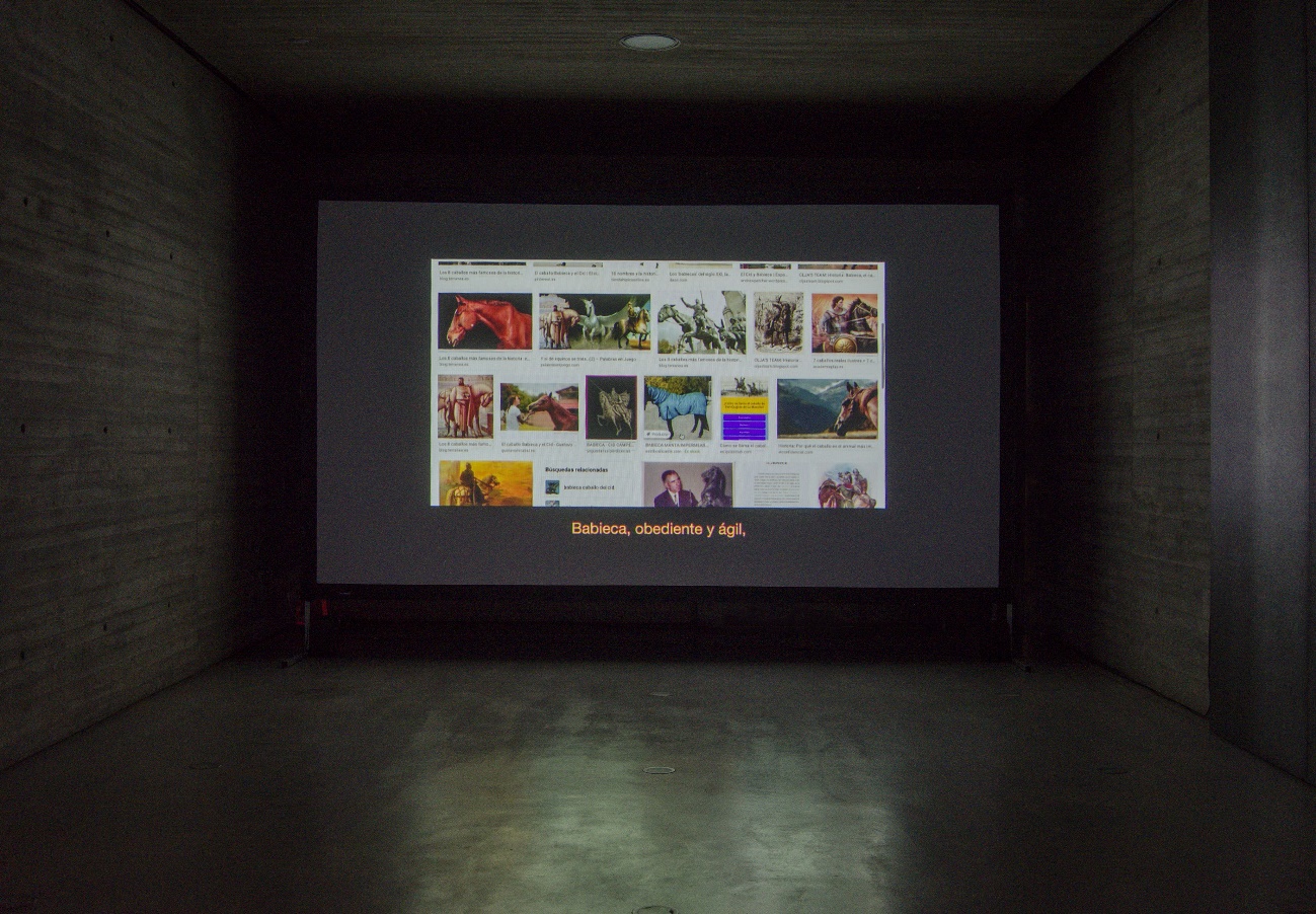 Cortesía de la artista.Recurriendo a la alocución por medio de la lectura del texto, el discurso alude al sur cómo un ‘otro’ que es representado desde la diferencia cultural y racial, “porque en el sur solo vive quien vive”; también de género, “Una que sirve solo para servir al centro, desde esa distancia que no incluye, su sur”. Con relación a la ciudad, estos ‘sures’ ocupan un espacio simbólico pero también físico concretizado en el barrio como periferia que alimenta al centro: “desde esa lejanía que fragmenta los brazos que sirven, las piernas que sirven, las bocas que sirven, las voces que sirven, que atomiza el cuerpo de la que sirve”. Siguiendo a Nancy Calomarde (2017) en la definición de sus ficciones territoriales postreras, los proyectos y diseños territoriales ubican a los cuerpos dentro de unas “narrativas oficiales que demarcan el espacio común, lo segmentan, lo ficcionalizan”, estableciendo a su vez “zonas de confort, de modernidad, de urbanidad, tanto como zonas de naturaleza o de barbarie, zonas de vida y de muerte, zonas dignas de ser vividas o abandonadas, zonas de fronteras” (Calomarde 2017), zonas servidoras y servidas. Estas reflexiones resumen en gran medida las intenciones discursivas que de manera directa se ven reflejadas en la forma en la que la creadora utiliza y se sirve de la comunicación tanto escrita como oral dentro de sus propuestas. A modo de cierre, todas las cuestiones anteriormente desarrolladas aparecen recogidas en esencia dentro de su proyecto audiovisual Caballeros castellanos (2020) (Fig. 10). Entendida como una formalización plenamente madura en cuanto al uso del texto y la oralidad a la hora de construir el discurso visual de la propuesta, la pieza investiga las implicaciones políticas que ha tenido el caballo andaluz en los procesos de colonización y en la construcción de la heteronormatividad desde la era Omeya en Al-Ándalus hasta la actualidad.