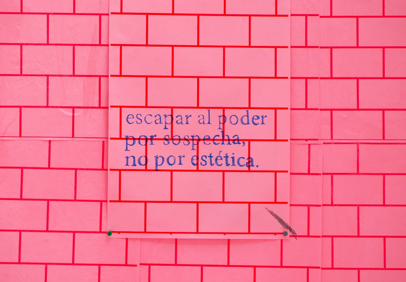Siguiendo las impresiones de Mikel Bilbao Salsidua (2015, 8): “El cartel es un medio de comunicación visual que, por lo general, aúna dos elementos: la imagen y el mensaje escrito” en la que la combinación de ambos “juega un papel esencial en la relación mensaje-público”. En multitud de ocasiones la artista se ha servido de este tipo de formatos utilizándolos de dos maneras: como objeto que puede funcionar de manera independiente o como módulo constructor desde un punto de vista instalativo y performativo. Focalizando la atención en aquel aspecto que por su novedad resulta más relevante, la segunda forma de uso de este se aprecia de manera directa en Poner el cuerpo: pensamiento coreográfico y dinamita, proyecto desarrollado en colaboración con Julia Guerrero en 2018. A través del pegado de carteles serigráficos producidos dentro de los talleres de La Escocesa en Barcelona, las artistas se sirvieron del cartel como herramienta para descolonizar el pensamiento y las instituciones que lo enmarcan3. Con esta intención reflexiva, ambas se enfrentaron al muro como soporte en el que volcar aquellas impresiones que desarrollaron durante la residencia. Así pues y como elementos desprendidos del cuerpo, los carteles fueron construyendo un mural en el que podían leerse diferentes frases y textos fragmentados que conformaban una suerte de gran mapa conceptual. El mismo año, otras copias de estas hojas fueron expuestas dentro de la 68ª Edición del Festival Jeune Création celebrada en el École Des Beaux-Arts de París. Para dicho evento, la artista erigió un ‘precario’ y efímero muro de papel en el que el patrón reticular de los pósteres generaba un fondo continuo que potenciaba un único enunciado (Fig. 3).