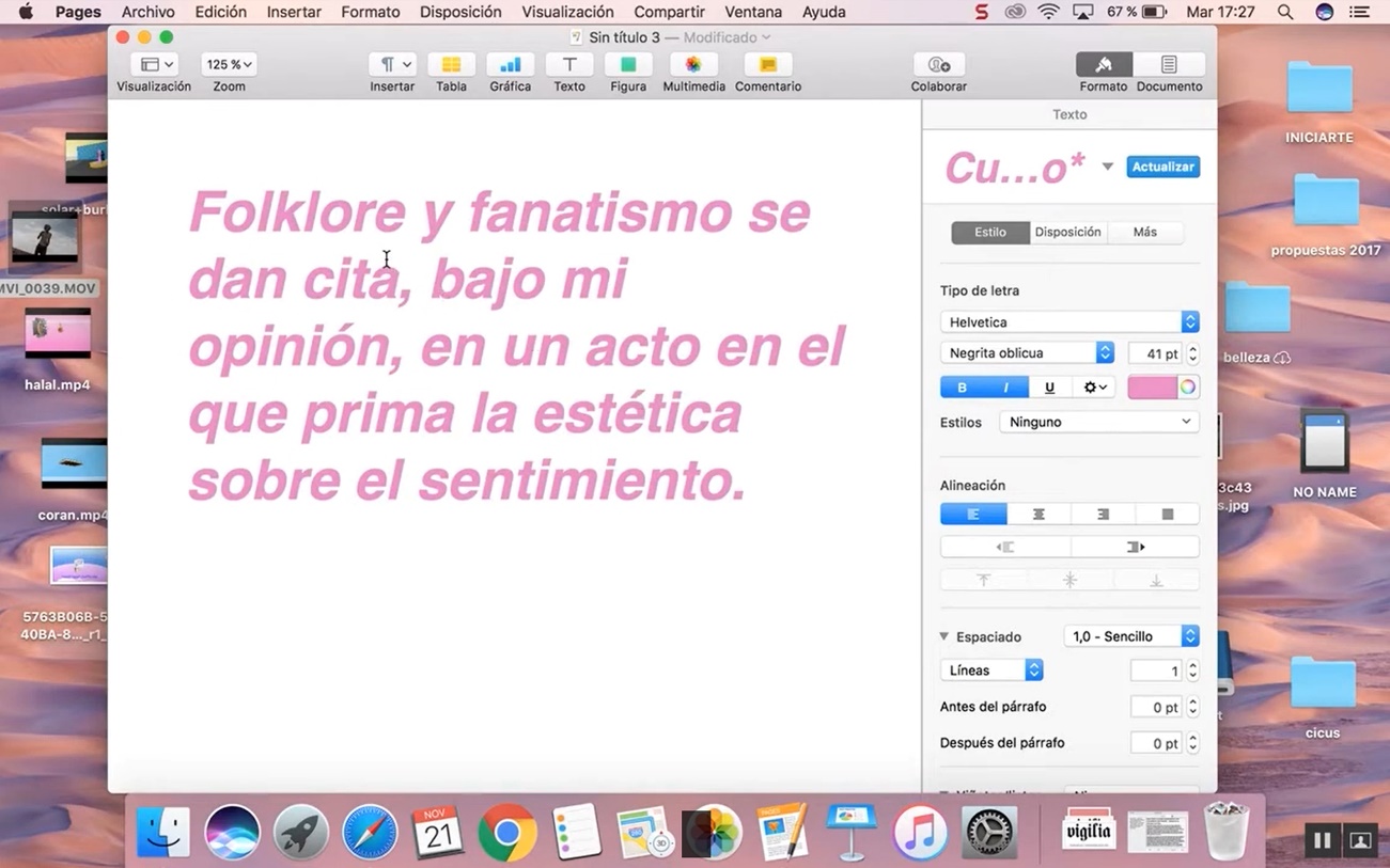 Cortesía de la artista.En esta intersección de referencias, la autora va deslizando el puntero por diferentes pestañas de las que emergen noticias sobre andaluces radicalizados en favor del terrorismo yihadista, estableciendo en una lectura oblicua similitudes entre este fanatismo religioso y el propio del folclore andaluz (Fig. 4). Recurriendo al lenguaje propio del mundo digital y de los youtubers, Alcaide explora de manera satírica e irónica a través del texto y la imagen fija y en movimiento diferentes tensiones políticas y culturales. A la vez que el texto adquiere importancia como unidad de comunicación, este construye visual y temporalmente una parte considerable de la pieza que es confrontada a un metraje en el que aparece la propia imagen de la artista. Otra de las propuestas de Alcaide que caminan en una dirección similar —no solo en el uso del texto sino en su atención a los formatos y lenguajes propios del mundo mediáticos— es Blogger affair de 2019. En concepto, esta propuesta mira como otras tantas de su autoría a las condiciones económicas de la clase precarizada a la que la artista pertenece. Bajo esta idea inicial, la propuesta reflexiona sobre la capitalización de la estética y la seducción de lo visual como herramienta imperante dentro de la sociedad actual: