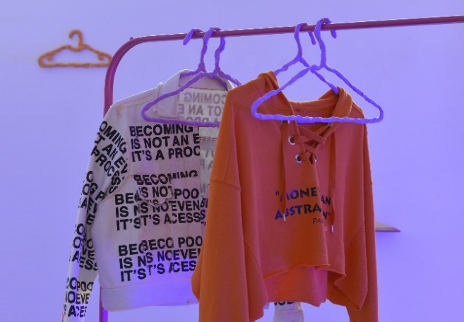 Como afirman Maurizio Lazzarato (1996) y Bifo Berardi (2001), la propuesta redunda en la noción de cognitariado. entendiendo dicho término como “la explotación cognitiva del proletariado” (en Treré & Cargnelutti 2014, 7). Focalizándose en la situación de los trabajadores culturales que “para desarrollar proyectos artísticos deben aprender a sobrevivir a la hostilidad de las llamadas industrias culturales“6, el proyecto recurre a las prácticas propias del mundo virtual para establecer una lectura de las estrategias artísticas entendidas como una “competición hacia el progreso donde nos convertimos en inversores de nosotros mismos“ (ibíd.). En este juego de irónicas referencias María Alcaide se convierte en una suerte de figura mediática llamada La materialista donde, a través de una videoperformance, la artista “Despliega estrategias y consejos propias de la sociedad del espectáculo y del mundo de la hipervisibilidad, tips para sobrevivir en un mundo de followers, branding y éxito”7. Así pues, y siguiendo unos planteamientos comunes a la pieza anteriormente citada, la artista se centra en la importancia del uso del lenguaje y las armas comunicativas de aquellos agentes protagonistas del mundo virtual mediatizado otorgándole en este caso una importancia principal a la oralidad del discurso por encima de la palabra escrita. De este modo, utilizando los lenguajes estéticos gráficos y visuales propios del medio, en la construcción del metaverso de La materialista convergen imágenes y textos que, en algunos de los casos, aparecen superpuestos y adheridos a prendas y bisuterías que ella misma confecciona (Figs. 5 y 6). Funcionando algunas de ellas como vestuario para las acciones que componen el video, estas piezas textiles fueron mostradas a su vez a nivel instalativo como parte de los resultados de la beca BilbaoArte dentro de la cual se fraguó la propuesta.