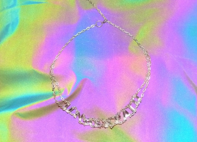 María Alcaide, Underpaid, collar, letras de metacrilato y metal plateado, medidas variables, Fundación BilbaoArte Fundazioa, 2018.