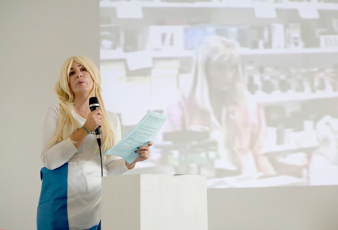María Alcaide, Speech (The happiest people in the world), video instalación y performance, bandera, peluca, protectores solares e impresiones, proyección de video, 6’ 15”, Muu Kaapeli, Helsinki, 2018.