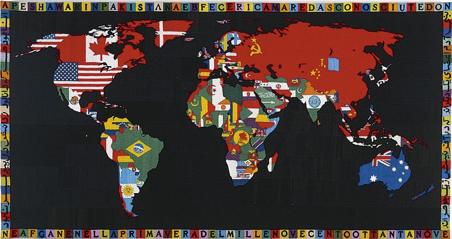 Con ese cambio de lealtades entre proyecciones rivales, Boetti puso de manifiesto que unas informaciones de apariencia objetiva, ejemplificadas en omnipresentes esquemas científicos y objetos cotidianos (como el mapa escolar), contienen una carga ideológica y no constituyen descripciones neutrales (Boetti 2011).