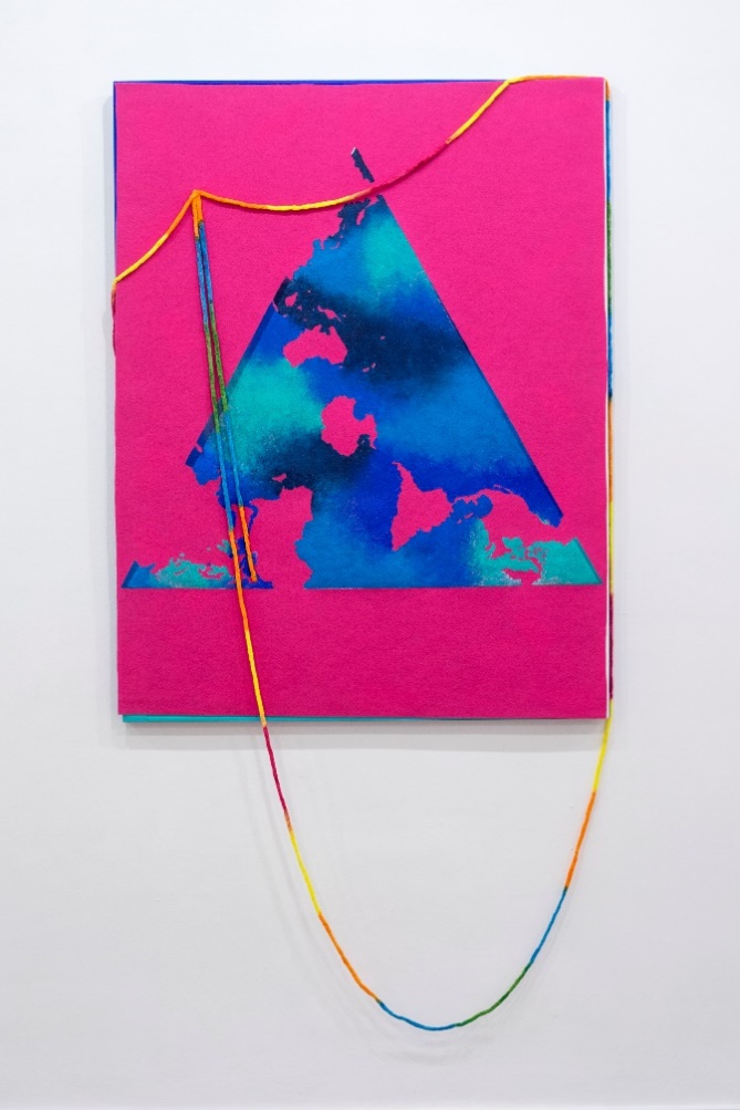 Por tanto, como podemos apreciar en las obras de las Fig. 3, 5, 6 y 7, se ha trabajado combinadamente tanto la pintura como el dibujo bidimensional, así como el dibujo en el campo expandido, algo que ya definió Rossalind Krauss (1979) al referirse a la escultura y que, progresivamente, se ha ido expandiendo a otras disciplinas y lenguajes artísticos dando lugar a propuestas cuyos límites disciplinarios son difusos o híbridos. Este es el caso de la obra titulada Guía psycogeográfica 2017: fuego_sapiencia/corazón_alma (Fig. 3), donde una línea de lana multicolor flexible, sin una forma estable ni rígida, emerge de la localización geográfica donde se encuentra la autora en el mapamundi triangular y sobrepasa los límites del formato rectangular como representación visual del momento que ésta estaba viviendo y del futuro y recorrido desconocido e incierto que le esperaba.