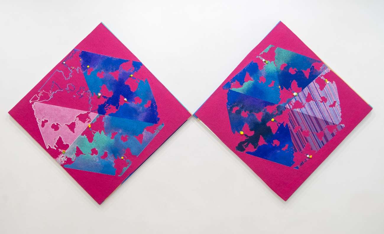 Elaboración propiaEn cambio, en el díptico Ósmosis entre dos (Fig. 6) de grandes dimensiones, reflexionamos, analizamos y plasmamos visualmente nuestra realidad vivida en pareja. Una relación de pareja experimentada y configurada por estancias en diferentes continentes y en continuo tránsito desde finales de 2011 hasta principios de 2017. En esta obra, nos apropiamos de la cartografía artística dual creada para la obra anterior (el rombo a través de dos triángulos equiláteros) para ponerla en rotación y conseguir así dos formas hexagonales que, como dos fragmentos de alicatados derruidos, se encuentran en desequilibrio. Por ello, en esta obra, las coordenadas se encuentran desperdigadas por los diversos rombos (cada rombo simboliza un año de relación y los dos triángulos equilateros de cada rombo representan a la unión de los dos miembros de la pareja) demostrando así la presencia/ausencia de nuestra relación sentimental, a lo largo de 5 años y medio, en diversas ciudades y espacios temporales. En definitiva, en estos dos formatos, se ofrece una deriva visual por las geografías múltiples del mapamundi teselado, pero también por las emociones y experiencias vividas, aguantando para no romper en dos (Fig. 7).