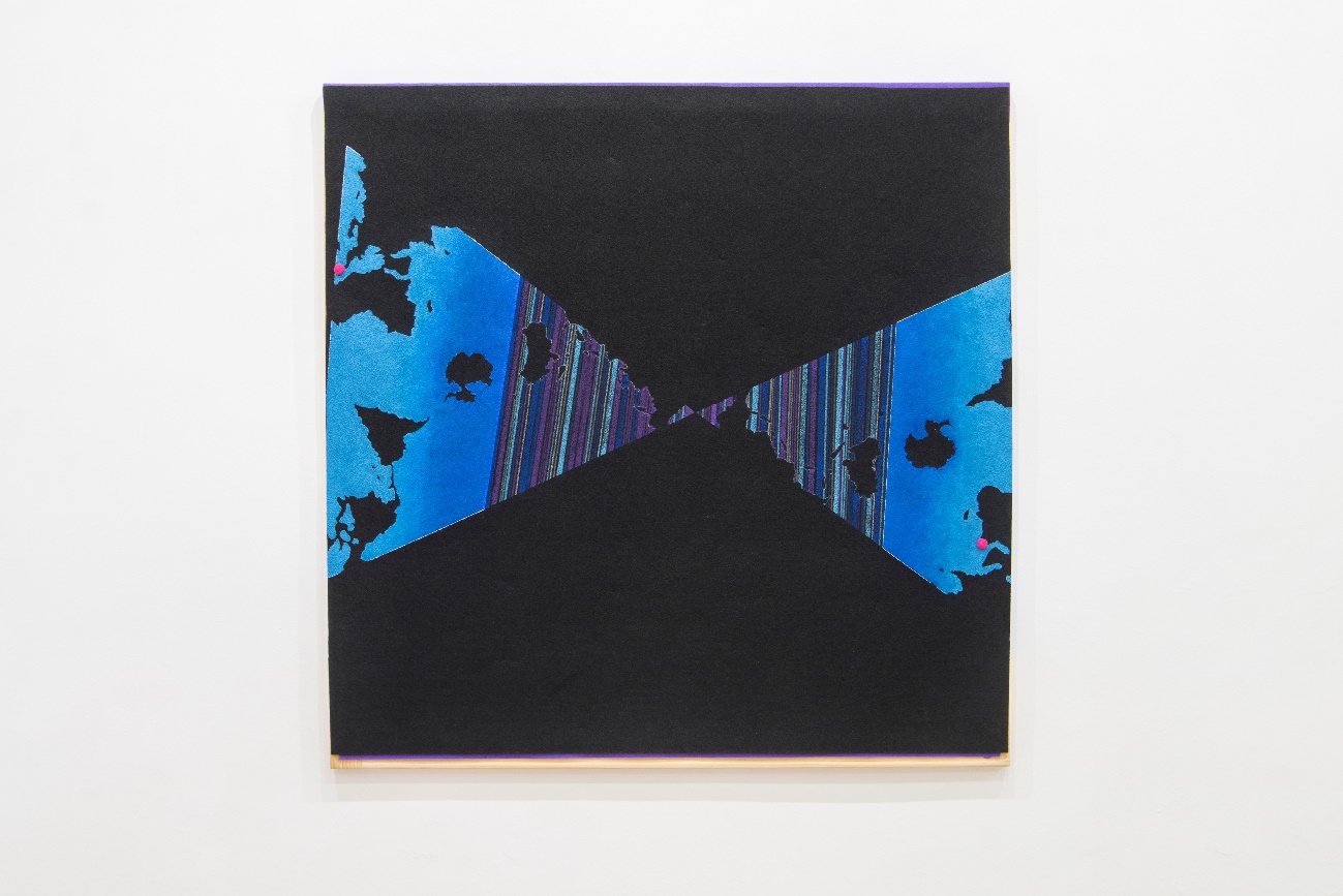 Se trata, por tanto, de un proyecto artístico y terapéutico elaborado a modo de una narrativa visual de nuestra realidad fragmentada en diversos formatos. En cada formato o cuadro, hay una forma geométrica elemental simple (Fig. 3) o repetida (Fig. 5 y 6) como es el triángulo equilátero, el cual contiene un mapa específico (completo o teselado): la proyección cartográfica de AuthaGraph world map (2016) del arquitecto japonés Hajime Narukawa (1971- ) (Fig. 4). Una proyección cartográfica que permite reducir el globo terráqueo en un conjunto de 96 triángulos equiláteros que, como las teselas de un alicatado andalusí, pueden componerse de diferente forma eligiendo cada vez un centro diferente (Castelnovi 2018). De este modo, AuthaGraph world map proporciona nuevas perspectivas para ver el mundo de forma equitativa, sea cual sea nuestro punto central elegido. Además, en cuanto al carácter simbólico de esta figura geométrica, “el triángulo equilátero simboliza la divinidad, la armonía y la proporción (…) También, según expone Platón en el Timeo, es representativo de la tierra, [Y, además,] la transformación del triángulo equilátero (…) se traduce por una pérdida de equilibrio” (en Chevalier [1969] 2018, 1020).