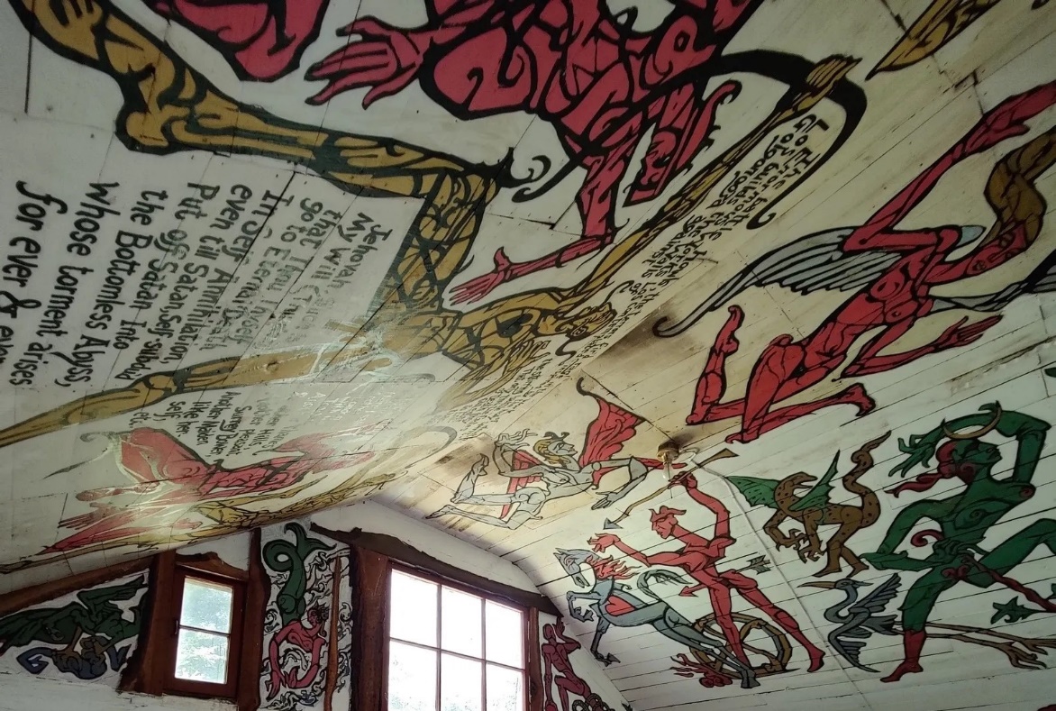 https://www.researchgate.net/figure/Decoracion-de-AEthelred-Eldridge-en-una-de-las-dependencias-de-la-casa-en-Athens-Ohio_fig3_365968141Paradójicamente, conforme la pareja Eldridge se esforzaba por construir la ciudad arquetípica asentada en los valores de William Blake en Ohio, más se alejaban de ella y, mientras tanto, otros buscarían alternativas para acercarse. Como apuntaría Kathleen Raine,
