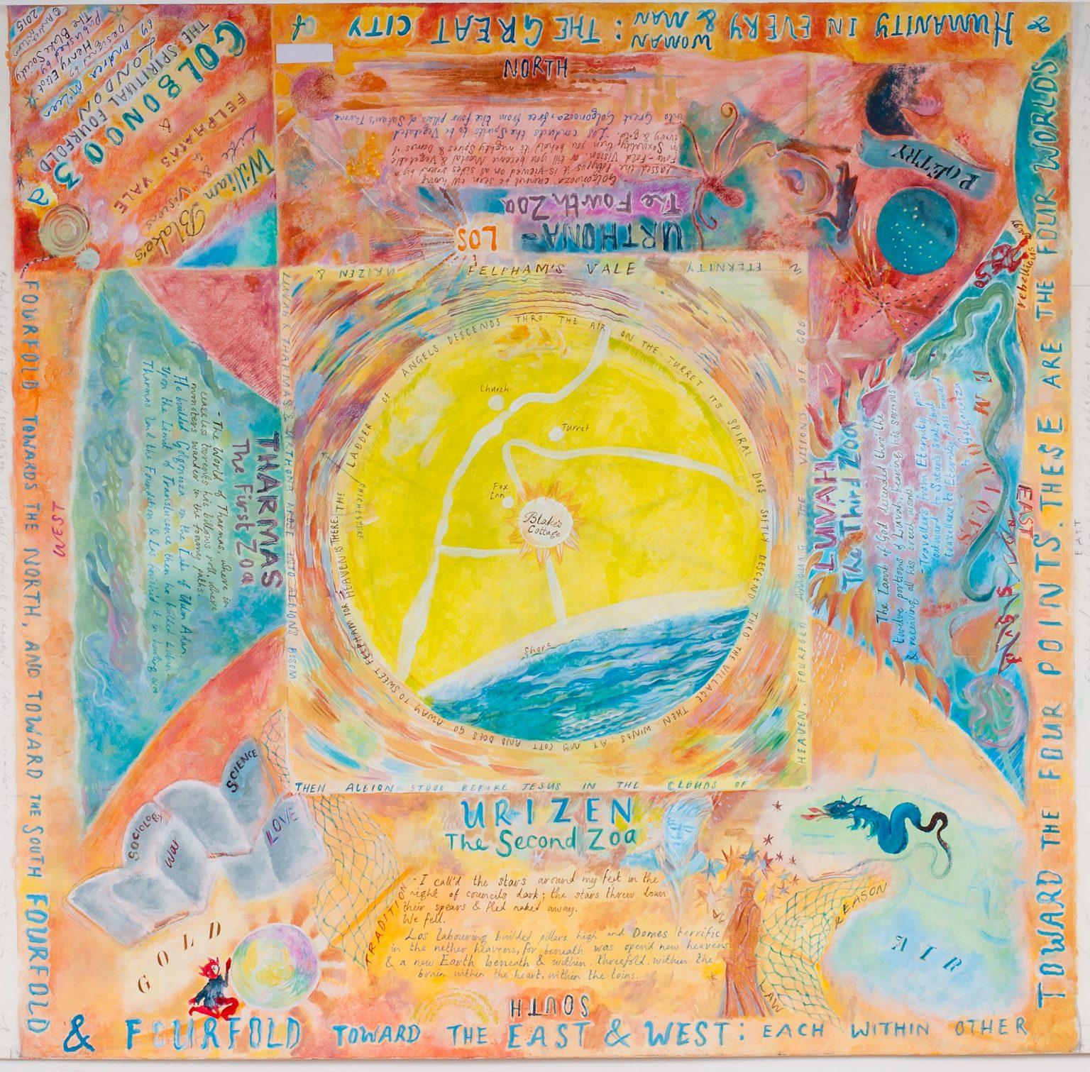 Artwork Archive. https://www.artworkarchive.com/A partir de ahí Andrea McLean organizará los aspectos de los cuatro Zoas como regiones anexas a Felpham, “animales [que] se precipitan hacia todas las direcciones” (Blake [1820] 1997, 130), en el orden que describe el poema Jerusalén: “Porque los cuatro universos que rodean el Huevo Mundano permanecen en el caos: Uno al norte, Urthona; Uno al sur, Urizen; Uno al este, Luvah; Uno al oeste, Tharmas” (Blake [1820] 1997, 131). Para replicar las peculiaridades de cada región la pintora recurre al uso de elementos distintivos de las cualidades del Zoas. Es por eso que Urthona, el de la libertad y la creación, viene acompañado del rótulo “Poetry”. Luvah, encarnación del amor, la pasión y la energía rebelde, se representa con la iconografía bíblica de la serpiente y la manzana flanqueada por llamas de fuego y con los conceptos “passion”, “emotions” y “rebellions energy”. Urizen, la personificación de la razón y la sabiduría, presenta la mayor cantidad de símbolos. Andrea McLean diferencia entre dos territorios para representar el metal de Urizen, el oro, mediante una roca y los libros en los que el anciano escribió “los secretos de la sabiduría” (en Blake [1827] 1969, 224), y su elemento, el aire, con una bestia alada y estrellas. Entre ambas regiones caen las redes de Urizen. Finalmente, en el Zoa Tharmas, que corresponde a las sensaciones, predomina un fondo azulado con el que la artista simula su elemento, el agua.