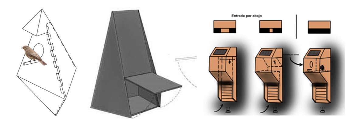 De izquierda a derecha distintos prototipos digitales, resolución de alojamiento de seres vivos insectívoros. El prototipo derecha, versión final similar al prototipo funcional intervenido junto con estudiantes de primaria.