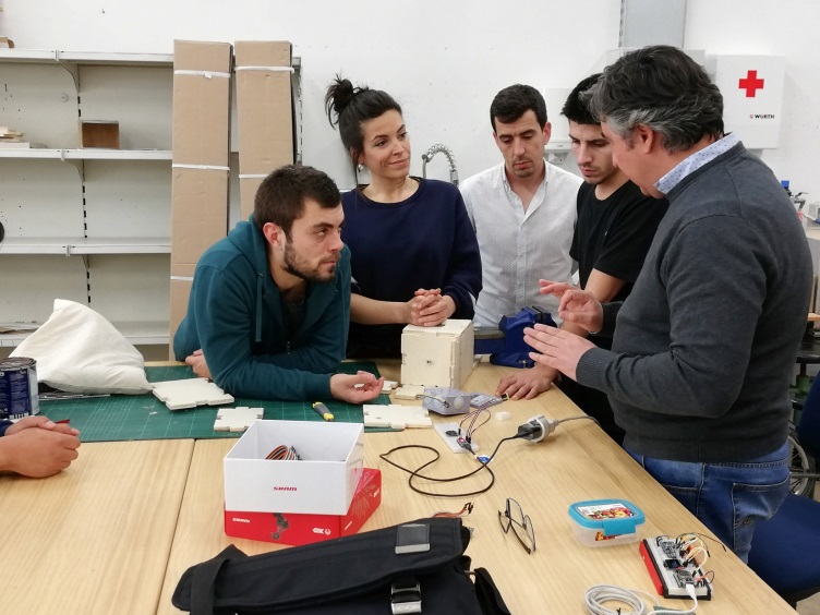 Estudiantes de diseño junto con el docente en el CIFE, centro de innovación y formación del profesorado (izquierda) mostrando el proyecto y el producto final a las maestras y maestros.