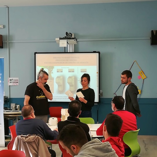Estudiantes de diseño del Centro de Arte y Tecnología (Etopía-CAT) mostrando el proyecto y el producto final: madera contrachapada sobre la que se troquelaron el conjunto de piezas que permitían el montaje de los distintos prototipos en función del ser vivo, decisión de los estudiantes de primaria.