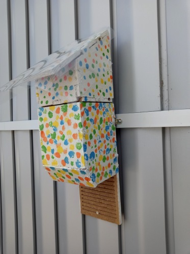Casetas de pájaros intervenidas y rediseñadas por estudiantes de primaria en los talleres artísticos y de diseño en colaboración con nuestros estudiantes. En la figura de la derecha caseta colocada en la fachada del CEIP Lés Allées-Vadorrey (Colegio de eduación infantil y primaria).