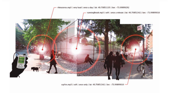 Como lugar de actuación. El espacio es un generador de signos, datos e información, como en el caso anterior, pero los trabajos se presentarán en el propio espacio que los genera. En la obra Tactical sound garden (2009) del arquitecto Mark Shepard, podemos ver una plataforma de medios móviles para el cultivo de “jardines de sonido” (fig. 6). Shepard creó una forma activa de participación e interacción social en los espacios públicos y entornos tecnológicamente mediados. La app permitía, a cualquier persona que viviera dentro de la red (wifi), podía escuchar sonidos, plantar o 'podarlos' dentro de un entorno de posición geolocalizado. La performance, también geolocalizada, del artista Gordan Savicic en el proyecto Constraint city/The pain of everyday life (2007), critica la sobreexposición del cuerpo a las señales inalámbricas que permanecen ocultas en el espectro (fig. 7). Savicic utilizó una chaleco que reaccionaba cuando detectaba una red inalámbrica próxima, de forma que, cuanto mayor era la intensidad de la señal Wi-Fi más sentía físicamente el código de la ciudad . Los paseos diarios a casa, al trabajo o hacia lugares de ocio eran recopilados en un mapa del dolor esquizogeográfico sacado de los servidores de GoogleMaps con scripts y bots automatizados.