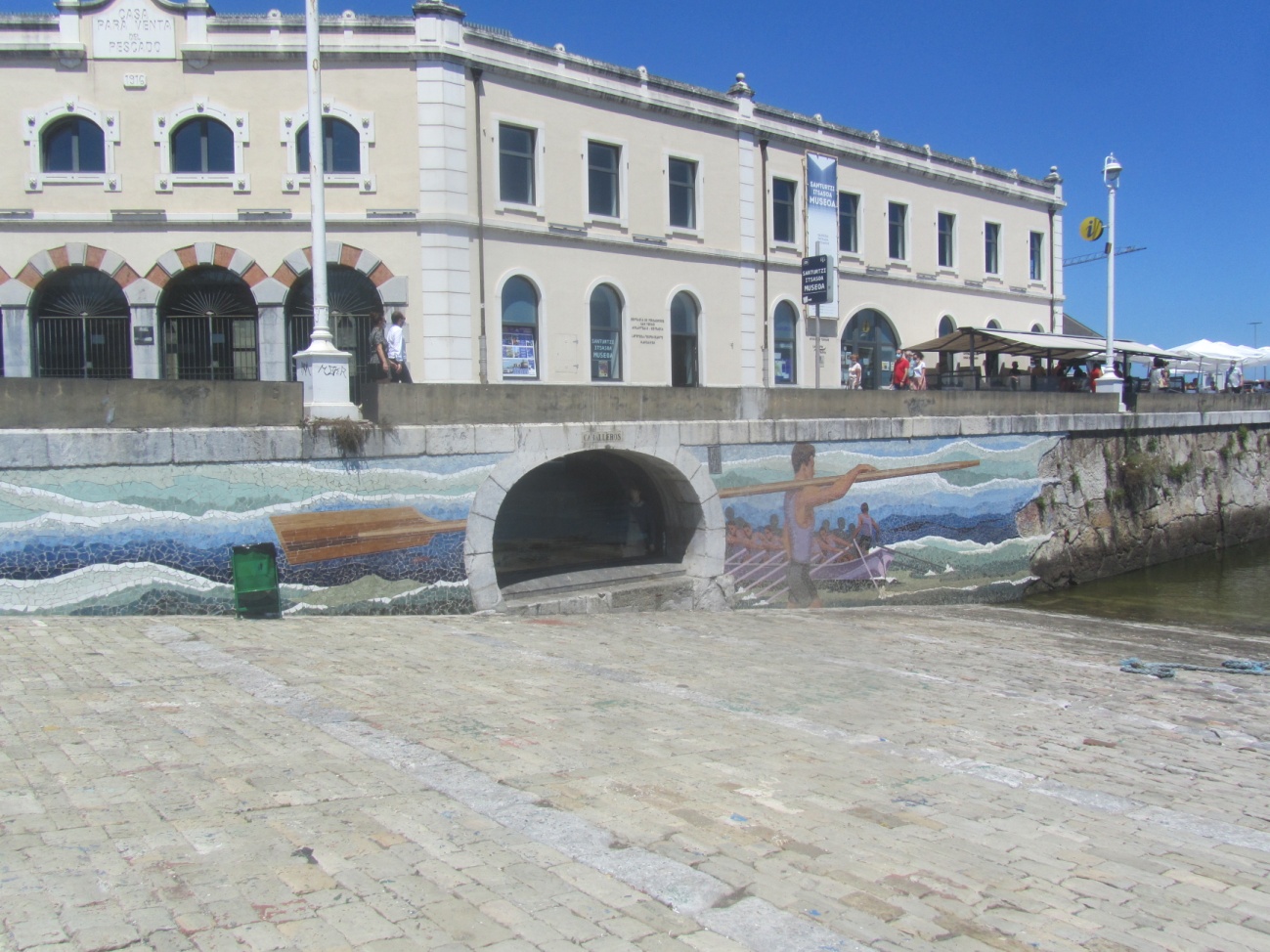 Mosaico homenaje al Club de Remo y edificio de la Cofradía. En la fachada principal los arcos de la lonja de venta pública de pescado y en el primer tramo de la fachada lateral la entrada al centro de interpretación y a la oficina de turismo municipales (2020).
