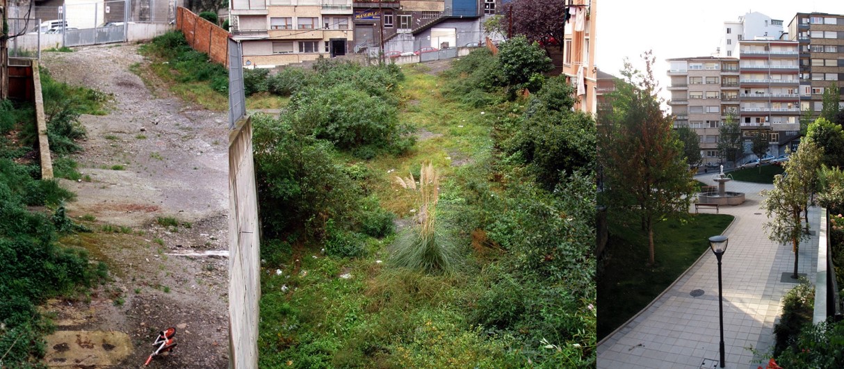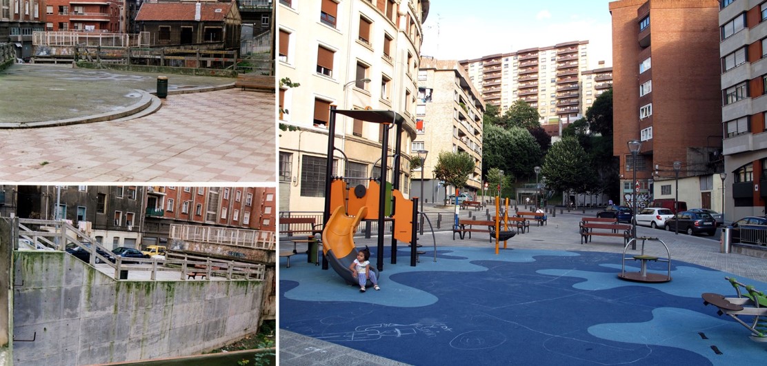 Plaza ‘intermedia’ remodelada mediante pavimentación, elementos lúdicos y mobiliario urbano en un espacio intermedio de la ciudad como ‘charnela’ entre ‘islas edificadas’ y suelos de ‘barbecho’.