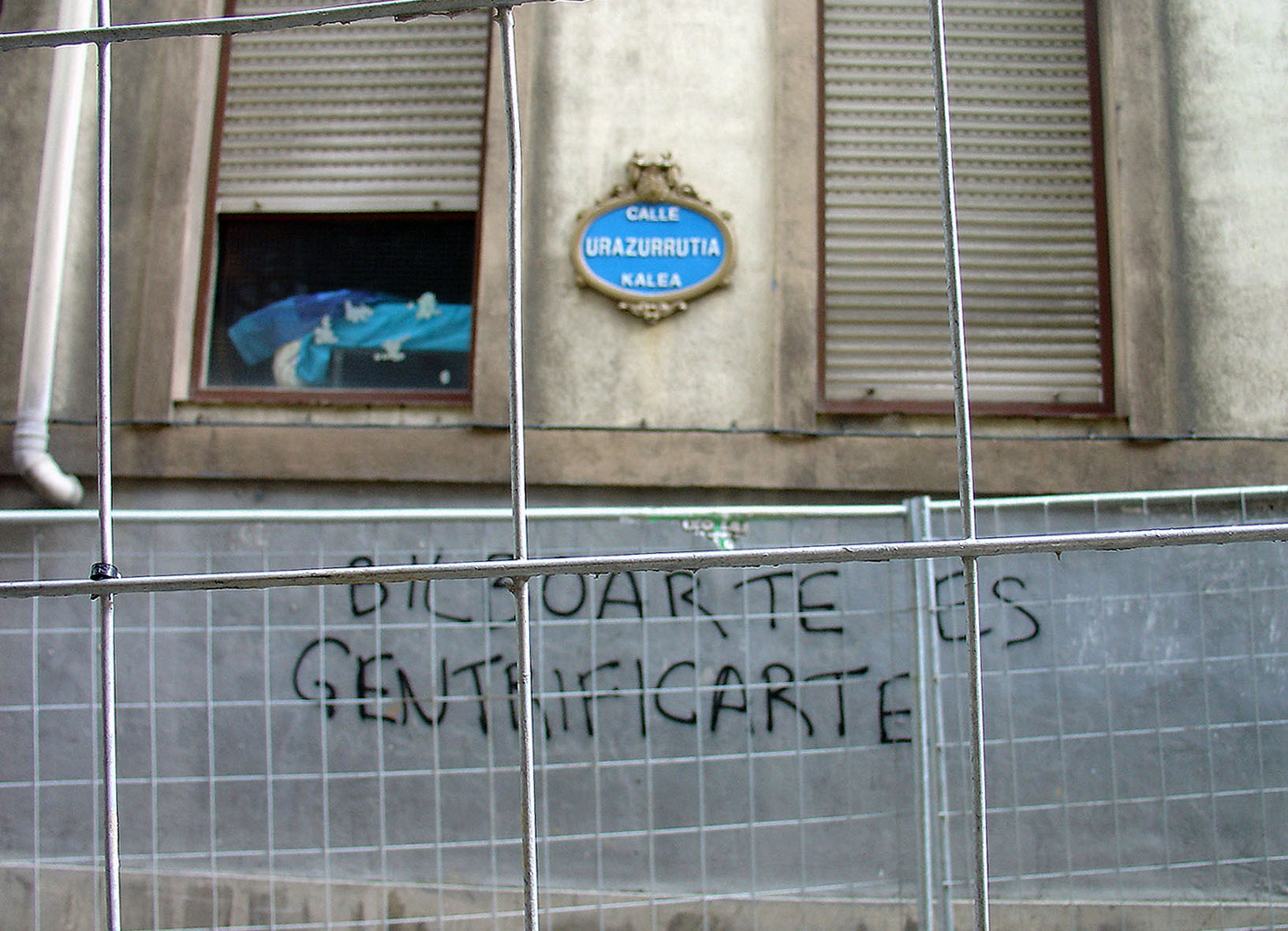 Expresivo ‘grafiti’ improvisado acerca del la ‘unión’ de gentrificación y arte en Bilbao La Vieja. Pintada que incide en esas dos vertientes presentes en el barrio histórico inmerso en planes estratégicos.