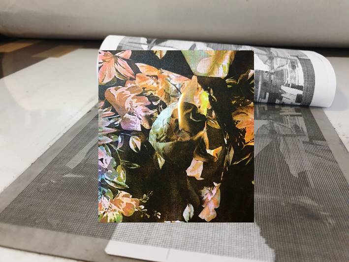 Composición estampa planográfica CMYK obra propia y detalle transferencia con reserva sobre acero, 2023.